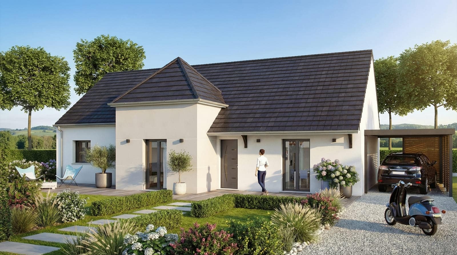 Ce modèle de plein–pied droit ou en « L » peut être décliné en combles perdus et est disponible de 100 à 141,5 m². Il répond comme tous nos autres modèles à la réglementation RT2020. La Domainière existe aussi en version à étage pour encore plus de confor
